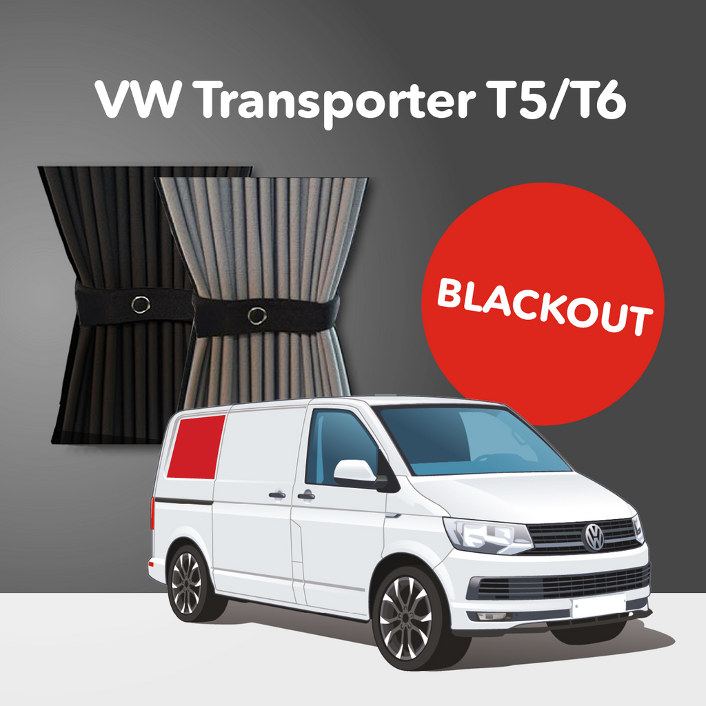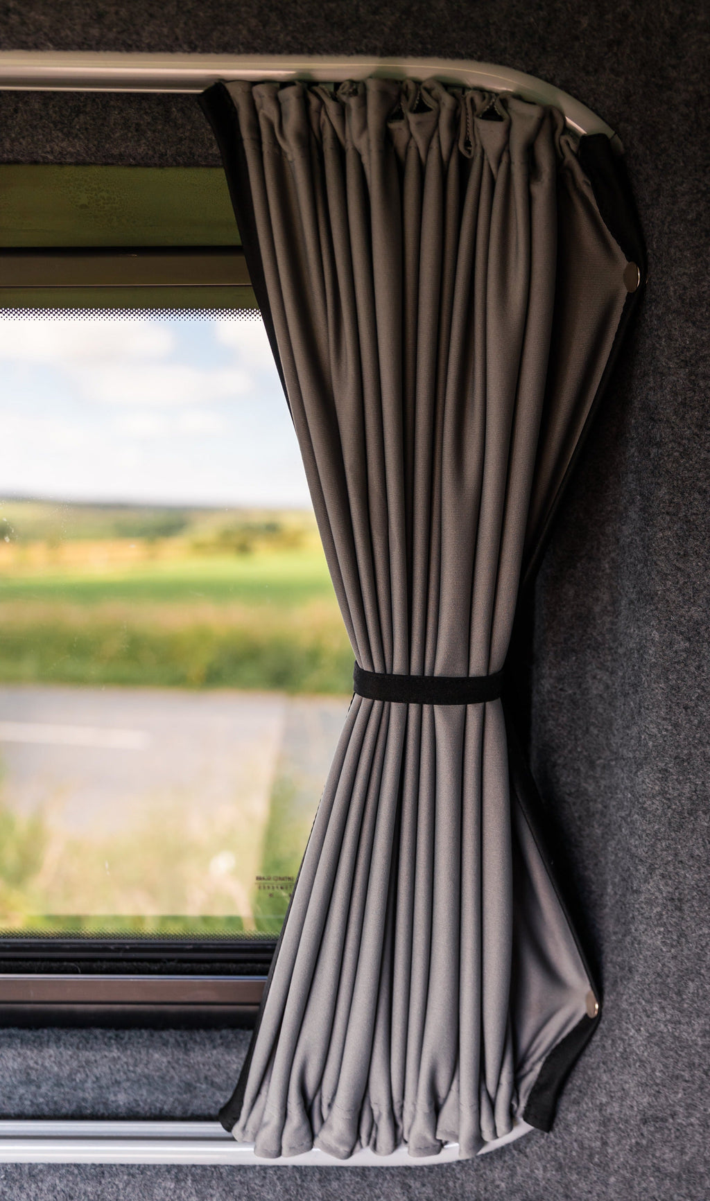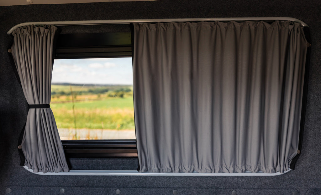 Kiravans blackout campervan curtains have a black finish on one side and grey on the opposite. They are double-lined for exceptional thermal insulation and a darker window covering than standard curtains.