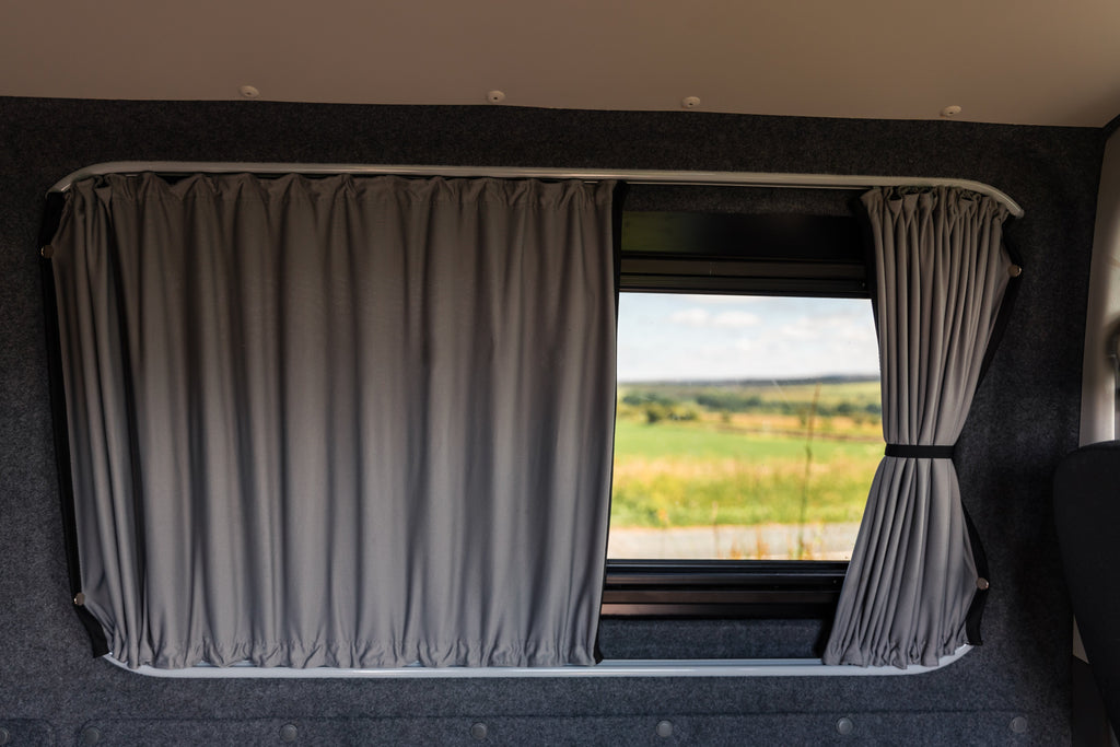 Kiravans blackout campervan curtains have a black finish on one side and grey on the opposite. They are double-lined for exceptional thermal insulation and a darker window covering than standard curtains.